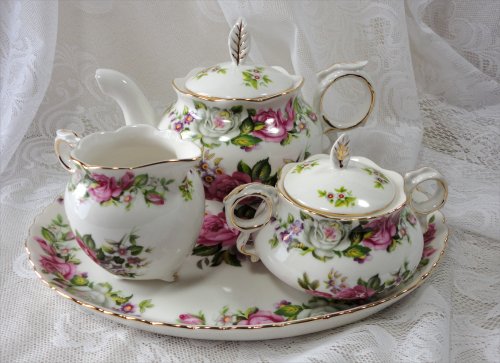 What a lovely, delicate and dainty tea set this is! Fine porcelain tea set includes tea pot, tray, sugar and creamer. Pretty white with deep pink roses and accents.