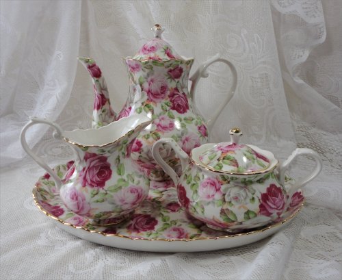 If you love roses, this is the set for you! So many pretty pink roses cover this fine porcelain set. Includes tea pot, tray, sugar and creamer. Teapot holds slightly over 2 cups of liquid, the perfect tea for two.