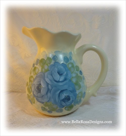 Lovely vintage ceramic pitcher has been hand painted with pretty blue roses. Both sides have been painted for a pretty look all the way around.