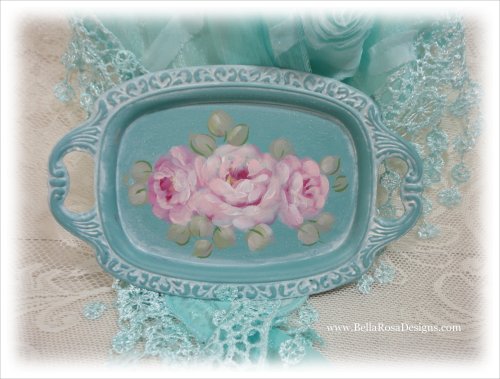 This sweet little tray is just the thing for to catch your jewelry at the end of the day. Measuring about 7" x 4 1/2" it will fit perfectly on the bathroom vanity or bedroom dresser without taking up much space. The tray is made of metal and I've painted it with a dark aqua background which really makes the pink roses pop. A wash of white highlights the details on the embossed edge and a light distressing allows a tiny bit of the silver to show through for a bit of sparkle. So pretty!