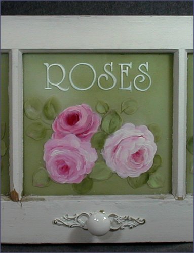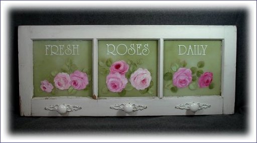 This antique window could have come straight from a florist shop. It is a unique vintage window, quite old, with the original glass. The white frame already had the perfect shabby finish, so I left it original in all its chippy, crackly, distressed beauty. A lovely sage green softly blended with white creates a gorgeous backdrop for the pink roses. The sage has been painted on the back of the window so as not to detract from the glass. Distressed ornate backplates and porcelain knobs have been added to give function to this piece - perfect in a bedroom or bath for hanging lingerie, robes, towels, etc. It would also be pretty in any other room and could be used to display a collection of vintage linens.
