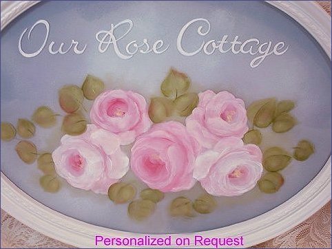 'Our Rose Cottage' is a stunning hand painted piece done on framed glass. The background is reverse painted on the back of the glass in a soft blend of pale blue and gray. The roses and lettering are done on the front, giving the piece the appearance of depth. Only the painted areas have been sealed which allows the beauty and sparkle of the glass to shine. The cottage white frame is made of syroco.