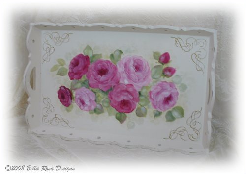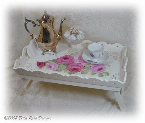 So gorgeous, this wood tray table is quite versatile. The legs can be folded under and secured in place so you can use it as a regular tray or fold the legs down and you have the perfect piece to serve breakfast in bed. Because the legs tuck up underneath it is very easy to display on a shelf as well. The finish is a lightly distressed, soft cottage white - almost a light ivory, but not quite. The hand painted cabbage roses are just stunning as well as the metallic gold accents in each corner. This is a piece you will be proud to use for serving guests or when you are treating yourself to a nice, relaxing afternoon tea.