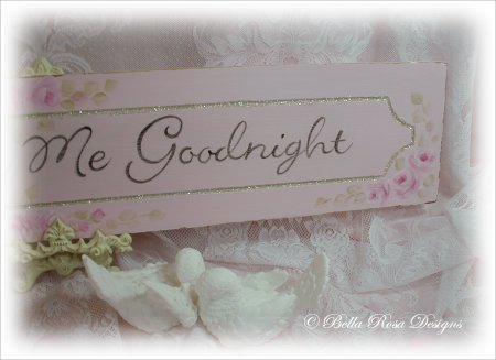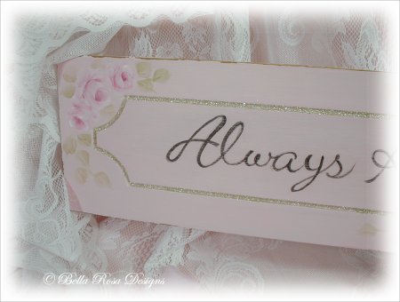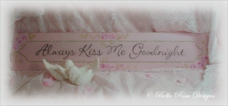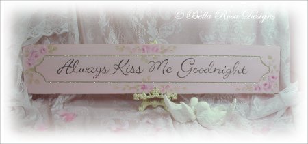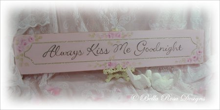 What a sweet and romantic piece! Always Kiss Me Goodnight has been hand painted on a vintage, solid wood cabinet door. It measures 31" wide by 6" tall. A soft, feminine pink background has been slightly distressed to add to the time-worn appeal and the delicate roses further enhance the romantic look of this sign. The finishing touch is the outline of silver glitter which is genuine German glass glitter. There is nothing which compares to the beauty and sparkle of glass glitter - although I couldn't capture its true beauty in the photographs, you can rest assured that it has an incredible sparkle and shine!